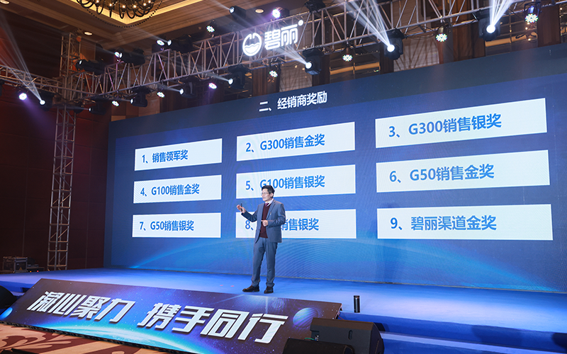 為了回報各位碧麗家人,答謝廣大終端客戶,2023年碧麗將以更為優質的產品、心動的政策感謝大家的支持,激勵各位經銷商伙伴不斷前進。峰會上,碧麗集團公布了2023年營銷政策、激勵政策、電商政策,表彰了"銷售冠軍獎"、"銷售領軍獎"、"G100銷售金獎"、"G100銷售銀獎"等多個獎項,并頒發了獎牌、豪華獎品以資鼓勵,真正的為經銷商帶來了看得見的實惠。