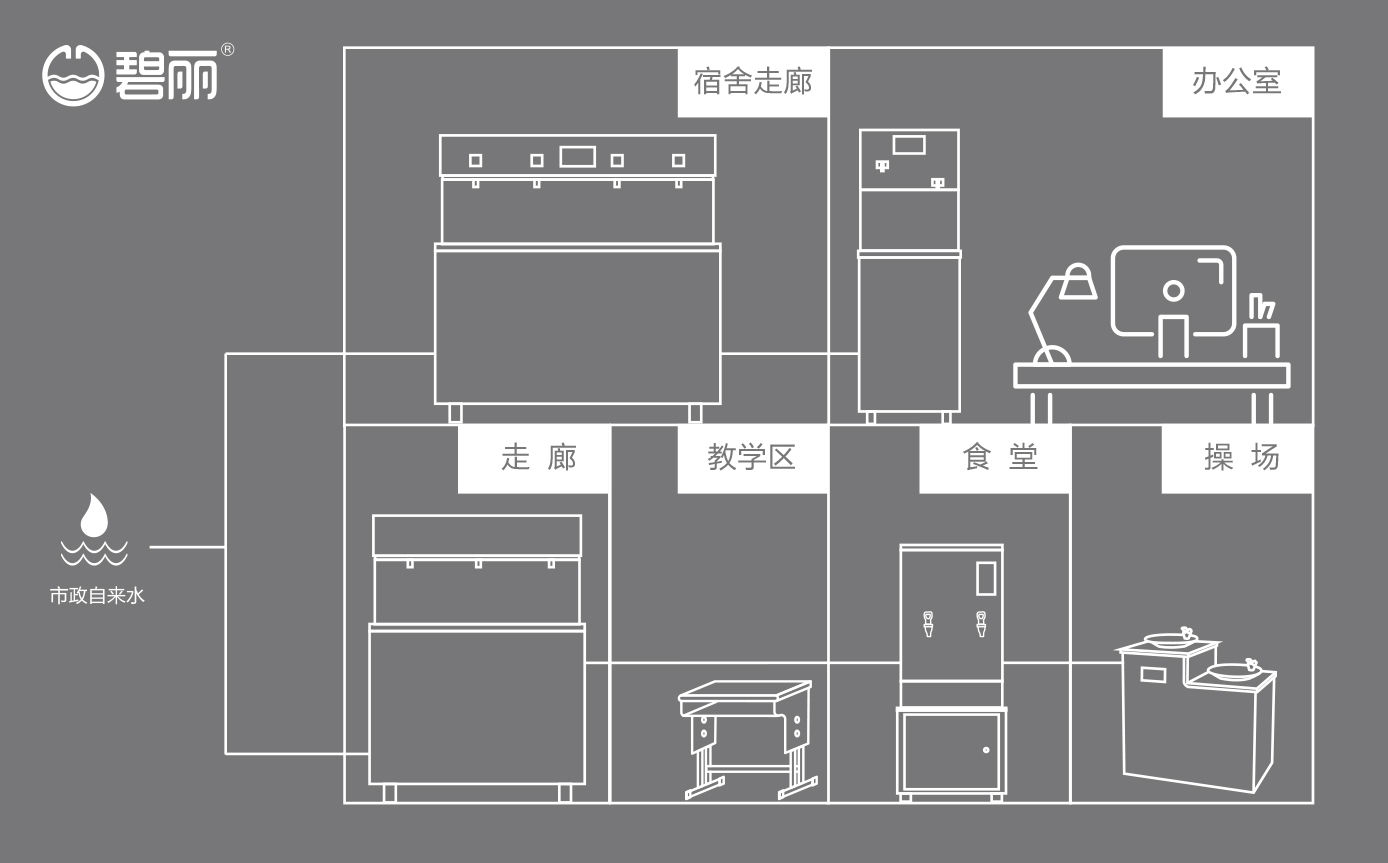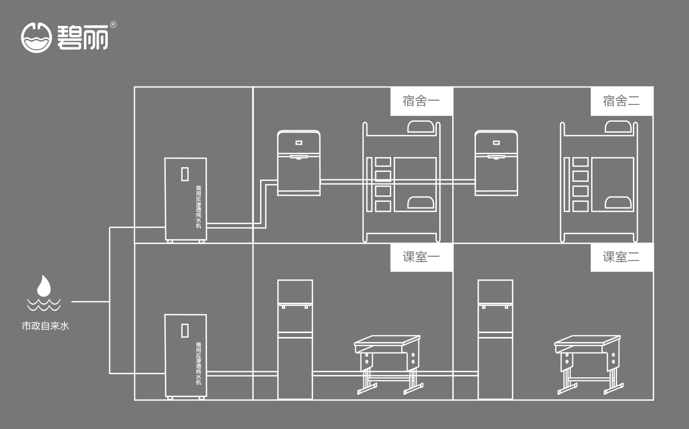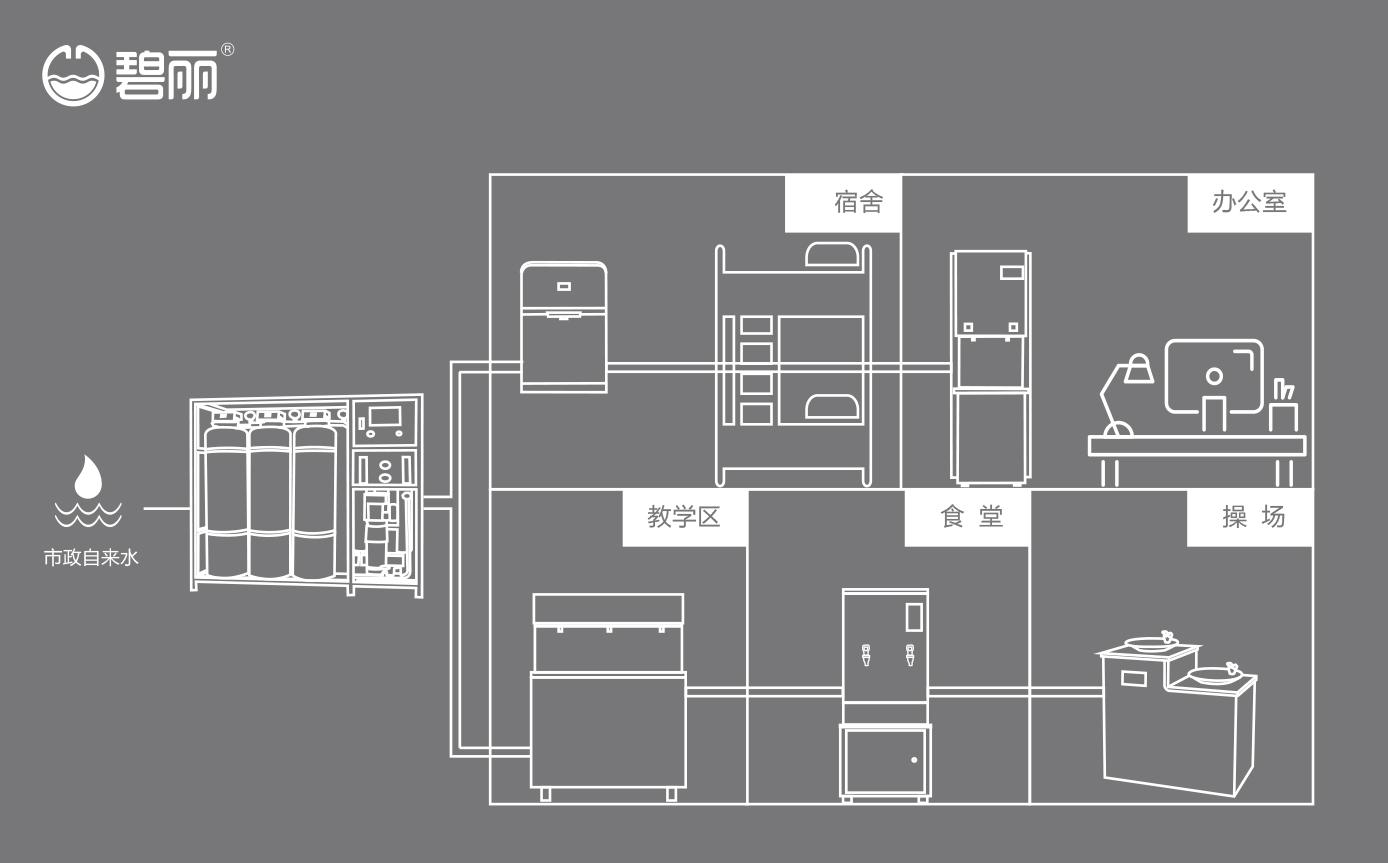 碧麗商用反滲透純水機(jī)將自來水集中處理后,把優(yōu)質(zhì)的純凈水通過專用的供水管道輸送到各飲水點;