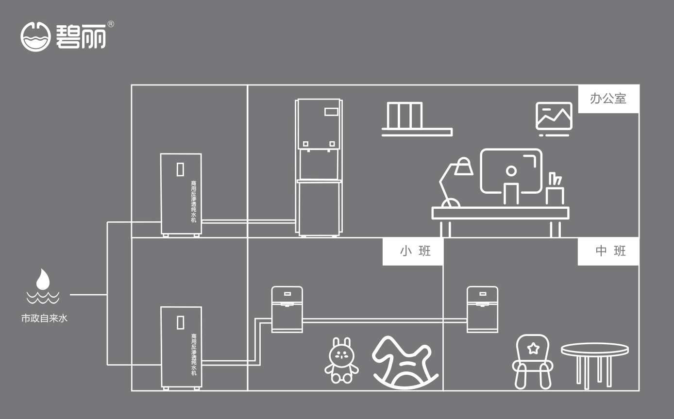 碧麗商用反滲透純水機將自來水集中處理后,把優質的純凈水通過專用的供水管道輸送到各飲水點;
