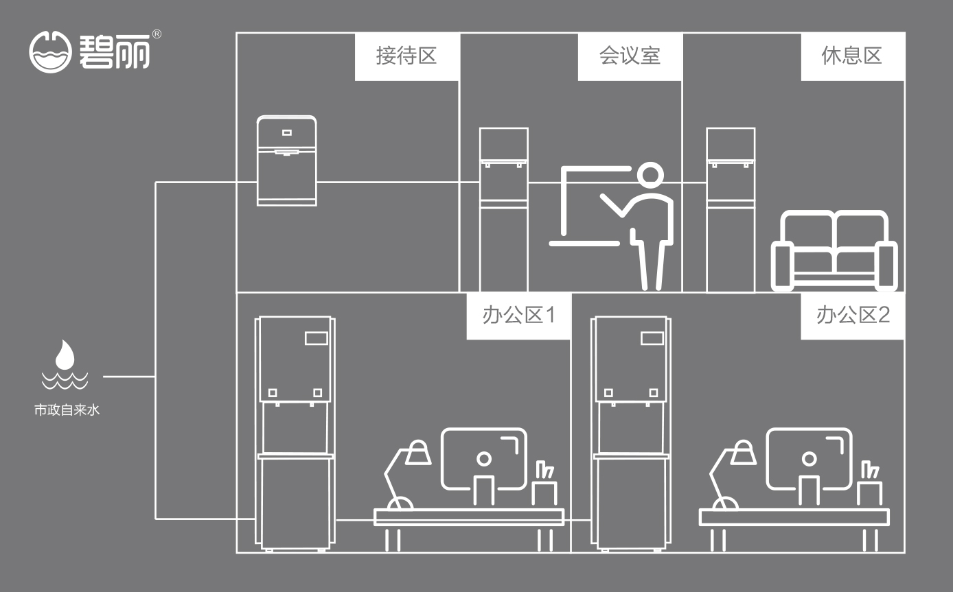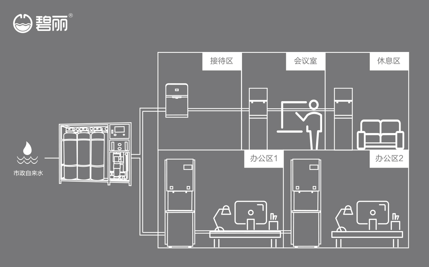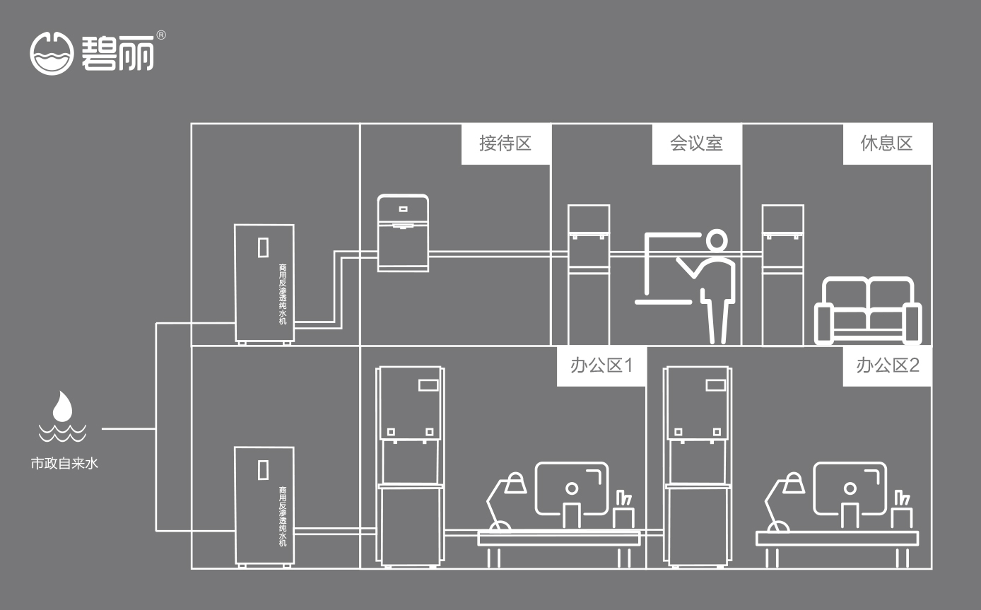 • 碧麗商用反滲透純水機將自來水集中處理后,把優質的純凈水通過專用的供水管道輸送到各飲水點;